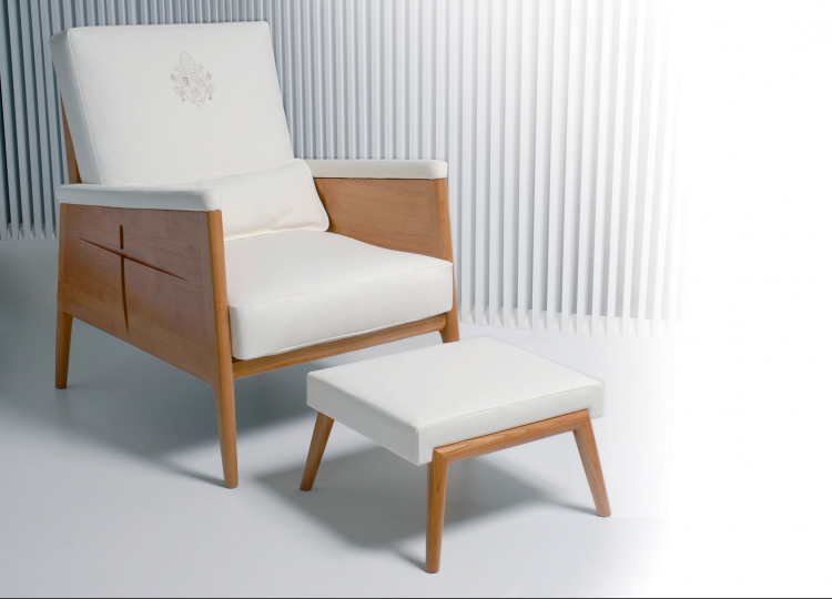 Produzida com recurso à madeira de castanheiro e pele gravada com o logótipo de Bento XVI, a cadeira utilizada pelo então Papa foi desenhada pelo arquiteto Audemaro Rocha.