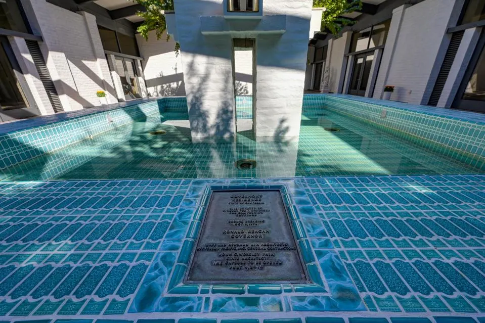 Construída como residência oficial do governo antes de ser vendida para propriedade privada, ela também apresenta os Grandes Selos da Califórnia na porta da frente e na entrada, um grande salão de baile com lustres, duas salas de estar e um bar interno com uma marca de bala distinta de um filme de John Wayne, supostamente presenteado a Reagan por Wayne para a mansão.