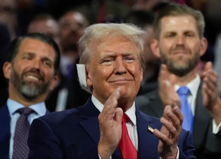 Trump entrou na Fiserv Arena por volta das 21 horas de segunda-feira, com uma ligadura a cobrir a ferida de bala na orelha direita, sentando-se entre o seu companheiro de candidatura, o Senador do Ohio J.D. Vance, e o Deputado Byron Donalds.
