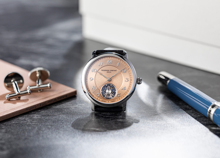 Este Slimline Monolithic Manufacture da Frederique Constant apresenta-se com uma paleta de cores inspirada no tom rosa, com números Breguet superdimensionados.