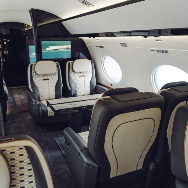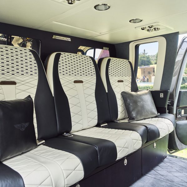 No interior, o formato dos encostos de cabeça e a costura dos bancos em pele Linen e Beluga serviram de inspiração para os bancos personalizados do Gulfstream G650 e os do Sikorsky S-76.