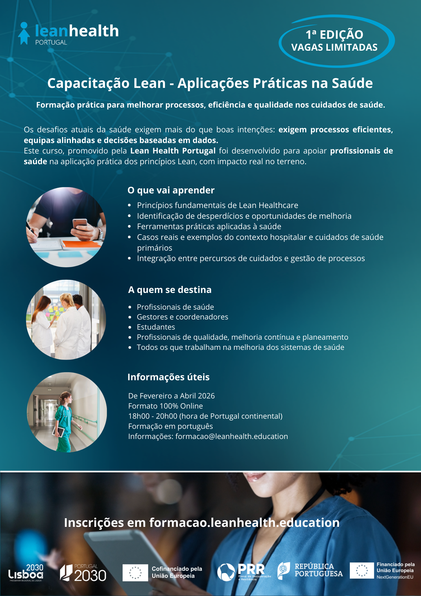 As inscrições para a Capacitação Lean – Aplicações Práticas na Saúde decorrem até 15 de fevereiro, com vagas limitadas. A primeira edição realiza-se entre 17 de fevereiro e 28 de abril, em regime online e pós-laboral.