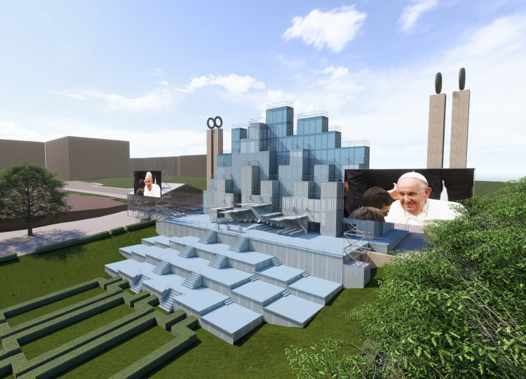 Da autoria do arquiteto João Matos, o altar-palco terá 40 metros de largura e 24 metros de altura, ocupando uma área total de 430 m2. “A obra custará cerca de 450 mil euros e será totalmente suportada pela Fundação JMJ Lisboa 2023, com o apoio de uma entidade privada”, refere em comunicado a Fundação JMJ.