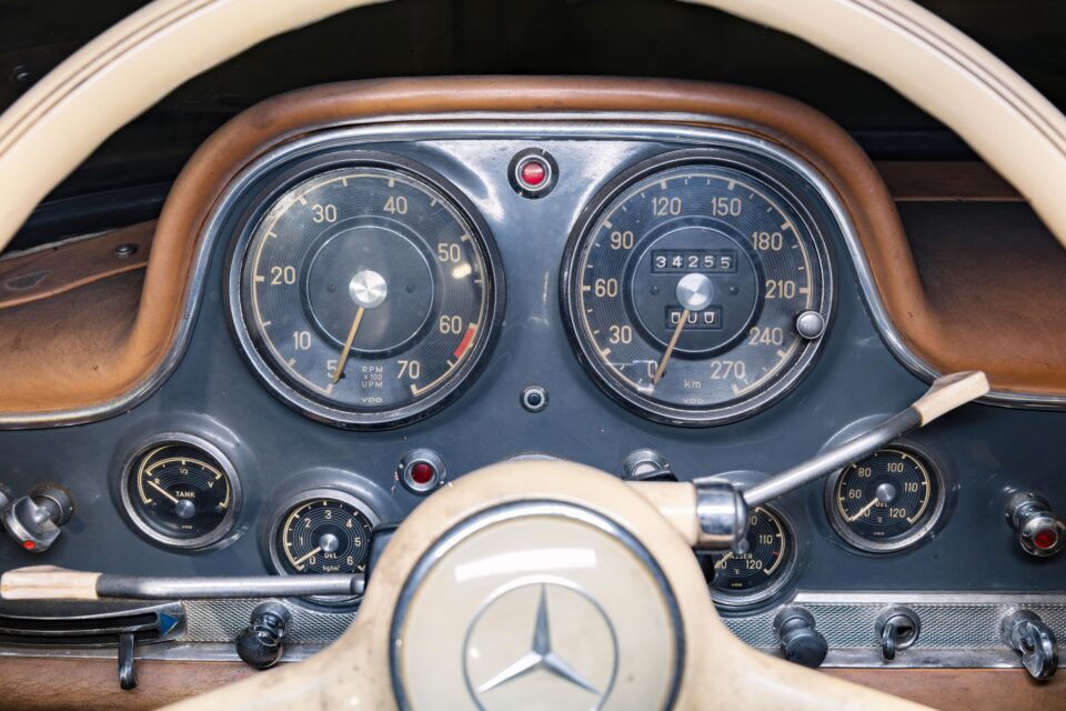 A lista de opções deste Mercedes-Benz 300 SL reflete um perfil exigente, orientado para performance: motor NSL com peças especiais para condução desportiva; molas, amortecedores e afinações para utilização de alto desempenho; jantes Rudge de aperto central; coluna de direção alongada; conjunto de bagagem em pele; e proteção anticorrosão e materiais de insonorização.